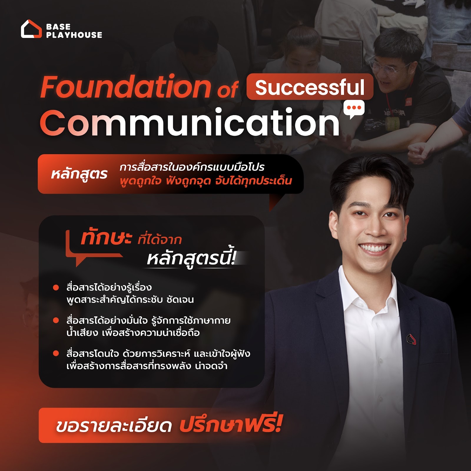 ดังนั้น หลักสูตร Foundation of Successful Communication จึงผสมผสานทั้งโมเดลการสื่อสารพื้นฐาน และกิจกรรมเชิงปฏิบัติจริงอย่างเข้มข้น เพื่อให้ผู้เรียนสามารถอ่านสัญญาณผู้ฟัง ออกแบบสารที่มีเป้าหมาย และถ่ายทอดด้วยความมั่นใจ เน้นเรียนรู้ผ่านการปฏิบัติจริง การสะท้อนคิด และการรับฟีดแบ็ก เพื่อสร้างการเปลี่ยนแปลงในทักษะการสื่อสารที่ยั่งยืน